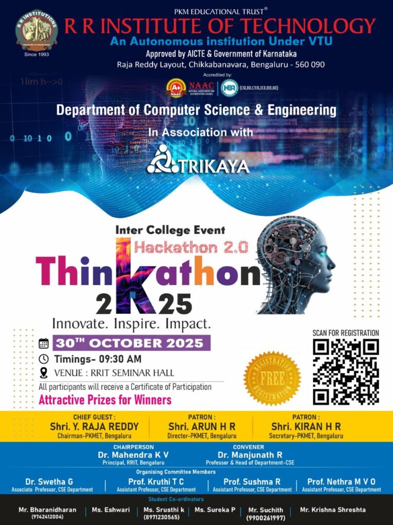 Thinkathon 2K25 – Inter College Hackathon 2.0 The Department of Computer Science & Engineering, RR Institute of Technology, in association with Trikaya, is organizing Thinkathon 2K25 – Hackathon 2.0 on 30th October 2025 at 9:30 AM in the RRIT Seminar Hall.
